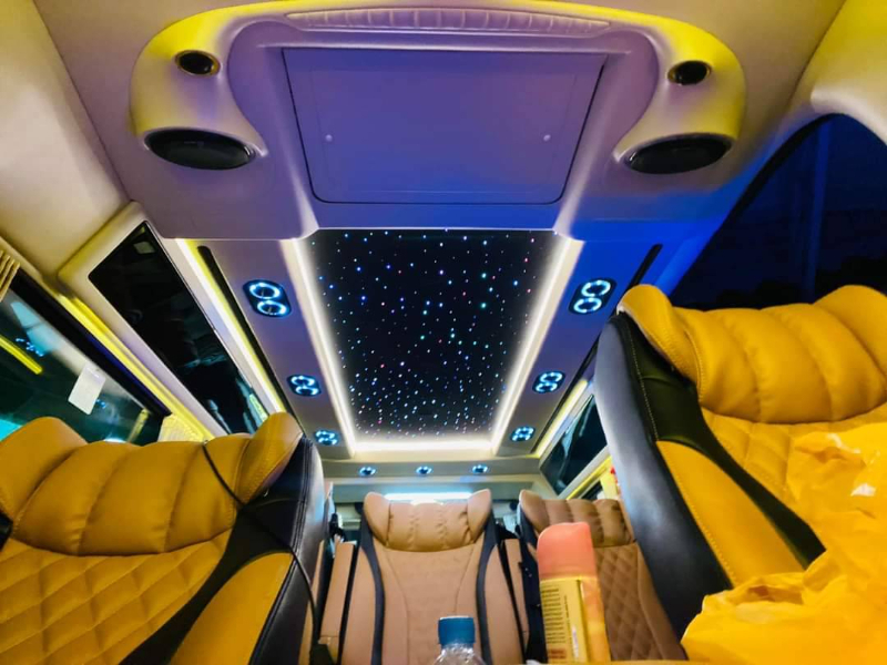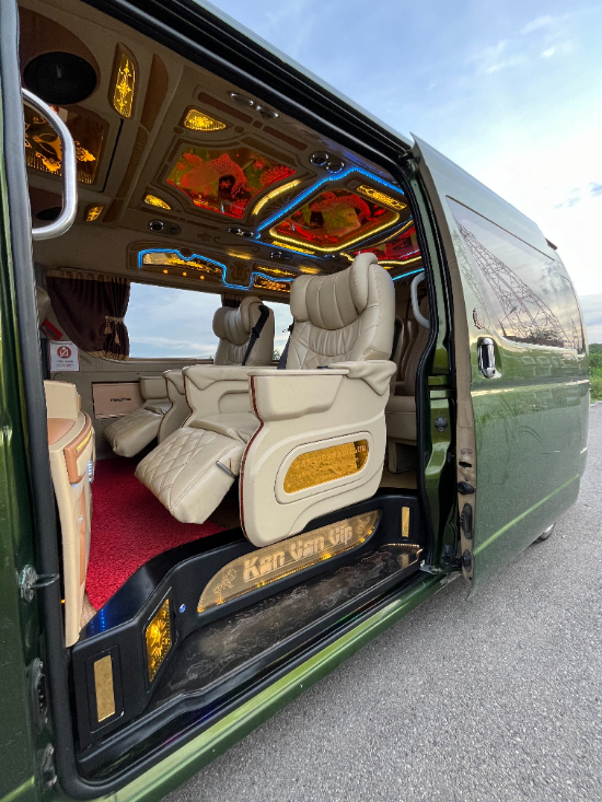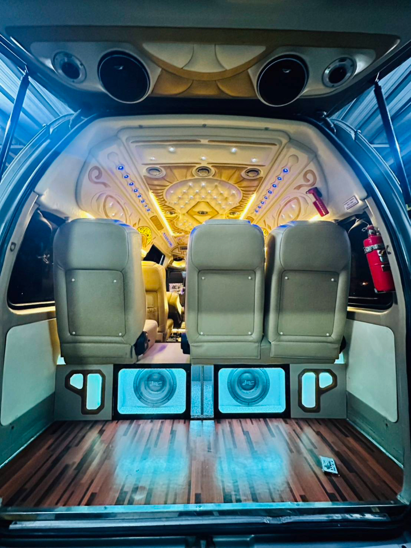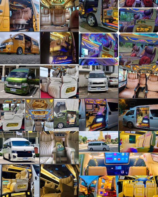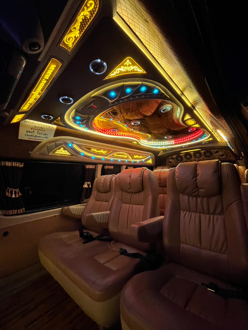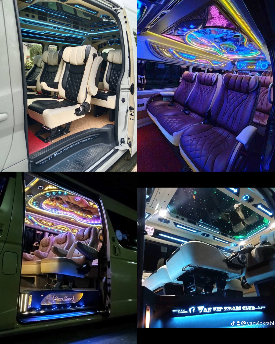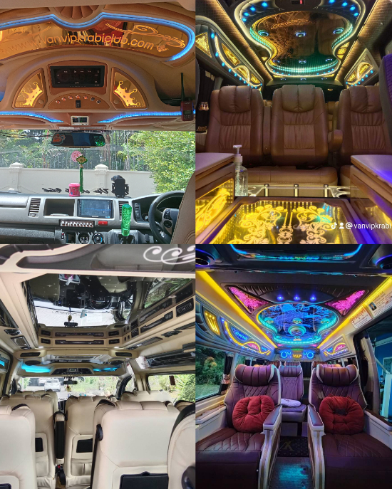 ภายในรถตู้ ตกแต่ง VIP พร้อมเครื่องเสียง คาราโอเกะ มีทีชาร์จ โทรศัพท์ทุกที่นั่ง เดินทาง ปลอดทุกเส้นทาง